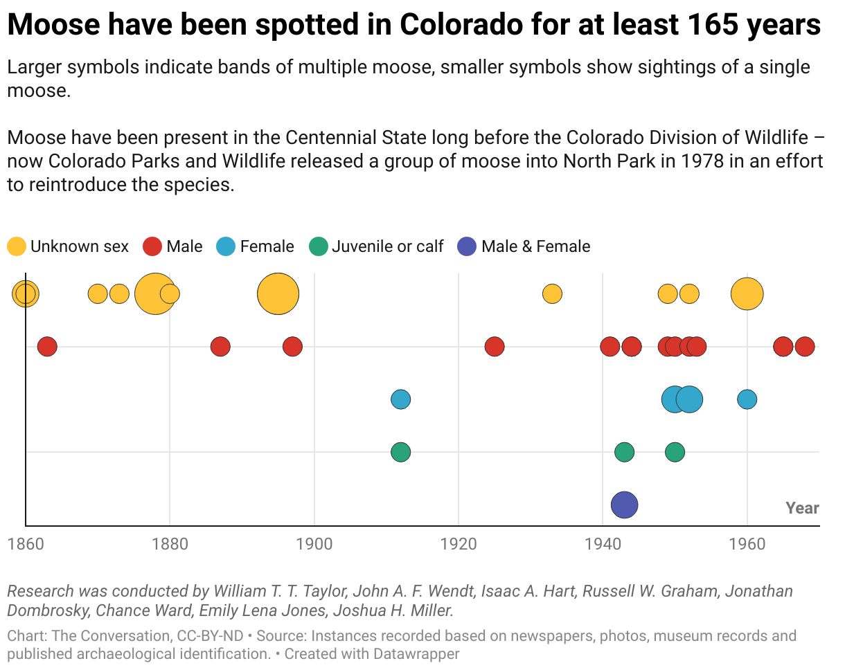Our archival research turned up even earlier sightings of moose in the area, along with many more across the region in the decades that followed. Diaries, newspapers and photo records from the past two centuries show the presence of not only young bulls, which at times can range widely, but also cows and calves, a sign that local breeding was taking place in Colorado before reintroduction.